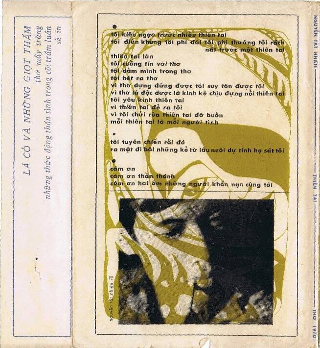 Đọc tới đây thì tôi thấy ngay một điều gì đó không ổn. Vào khoảng gần cuối năm 1970, lúc tôi đang học lớp Đệ Tam (lớp 10 bây giờ) thì anh Nhiên có xin phép thầy hiệu trưởng mang tập thơ Thiên Tai, với bút hiệu Nguyễn Tất Nhiên hẳn hòi, vào từng lớp để bán vì tập thơ in xong mà tác giả chưa chạy đủ tiền để trả cho nhà in. Chi tiết này cũng được nhà báo Hà Tường Cát, vốn là thầy dạy của chúng tôi tại trường Trung Học Ngô Quyền, kể lại trên một bài viết được đăng báo vài ngày sau khi anh lìa đời. Cũng qua bài “Vài Kỷ Niệm Về Nguyễn Tất Nhiên” (nhật báo Người Việt, số 2481 ngày 8 tháng 8 năm 1992), tôi mới biết thêm là hình bìa tập Thiên Tai do Đinh Cường vẽ chính là “công” của thầy Cát (vì đối với giới học trò làm thơ như chúng tôi lúc đó, có hình bìa Đinh Cường là một điều rất đáng nể, rất “ngầu,” nghĩa là một ấn tượng rất khó quên!). Vì thời cuộc, tập Thiên Tai đến nay hầu như không còn nữa nhưng không hẳn đã tuyệt bản. Nhà thơ Nguyễn Hoàng Nam, em trai của anh Nhiên, đã may mắn còn giữ được một bản và giúp tôi gửi đến độc giả bản sao bìa trước và bìa sau của cuốn thơ này, như một di vật của người quá cố. Nếu vì một lý do nào đó, độc giả không coi được hình bìa thì xin mời vào trang nhà của Hội Ái Hữu Cựu Học Sinh Ngô Quyền để tham khảo (ngo-quyen.org).