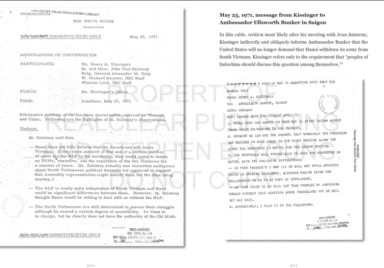 Cùng ngày này, 25/05/1971, Kissinger gửi thư đến Bunker, có thể là sau cuộc gặp với Jean Sainteny với nội dung không nói thẳng là Mỹ sẽ không yêu cầu Hà Nội rút quân khỏi miền Nam Việt Nam.