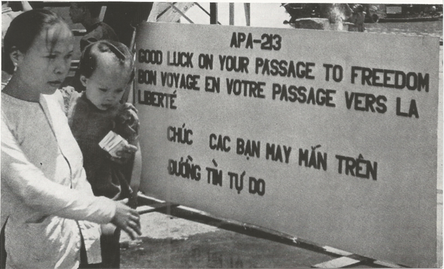 Gần con tàu, những tấm bảng chào đón những người tị nạn bằng ba thứ tiếng: "Chúc các bạn may mắn trên đường tìm tự do" (trang 859). Các tình nguyện viên đã trao "bộ đồ dùng chào đón" gồm xà phòng, khăn tắm, kem đánh răng và hộp sữa có dán nhãn "Từ người dân Hoa Kỳ đến người dân Việt Nam - một món quà."