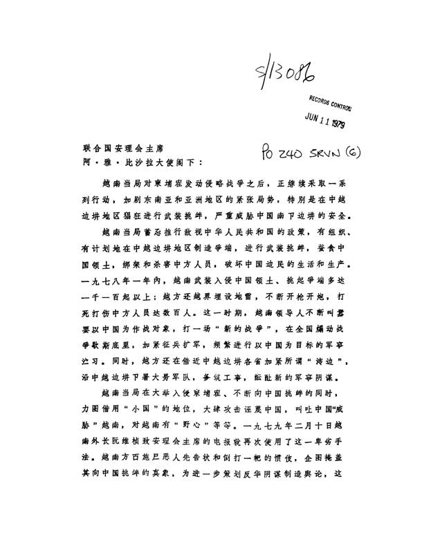Các nhà cầm quyền Việt Nam đang theo đuổi một chính sách xâm lược và bành trướng ra bên ngoài, chính v́ thế đe dọa nghiêm trọng ḥa b́nh và ổn định tại Đông Nam Á và toàn thể Á Châu. Điều này đương nhiên khơi dậy sự quan ngại và lo âu của mọi nước tại Á Châu và phần c̣n lại của thế giới. Chúng tôi thành thật hy vọng rằng Liên Hiệp Quốc sẽ bảo vệ công lư, hành xử các chức năng và thẩm quyền của ḿnh và có các biện pháp cần thiết khiến cho các nhà cầm quyền Việt Nam sẽ tức thời ngưng lại các sự đột nhập và khiêu khích vũ trang chống Trung Quốc, tức thời đ́nh chỉ cuộc xâm lược và chiếm đóng quân sự của họ tại Kampichea, triệt thoái mọi lực lượng của họ ra khỏi Kampuchea và tức thời ngưng mọi hành vi của họ làm phương hại đến ḥa b́nh và an ninh của Đông Nam Á, phần c̣n lại của Á Châu và toàn thể thế giới.