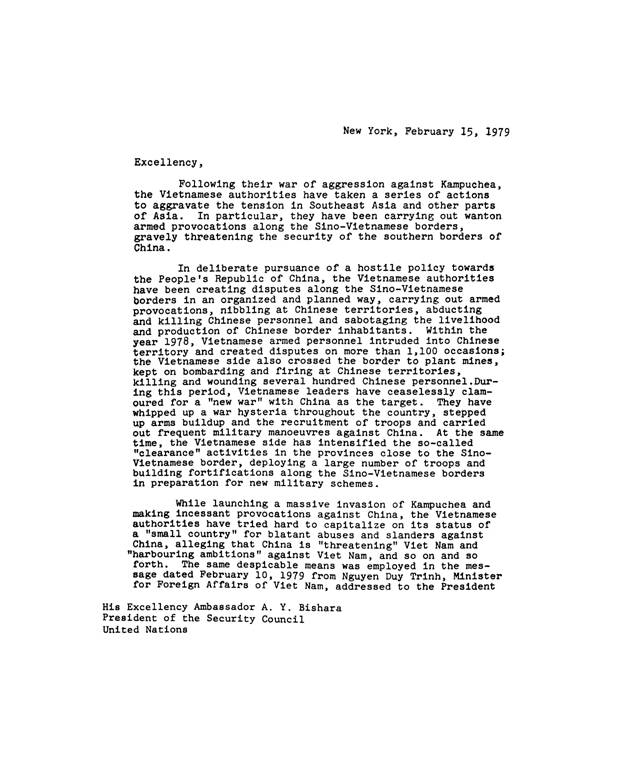 Trong khi phóng ra một cuộc xâm lăng ồ ạt vào Kampuchea và không ngừng khiêu khích Trung Quốc, các nhà cầm quyền Việt Nam đă ra sức để lợi dụng tư thế một “nước nhỏ” của nó cho các sự lạm dụng và phỉ báng trắng trợn chống lại Trung Quốc, tố giác rằng Trung Quốc “đang đe dọa” Việt Nam và “ấp ủ các tham vọng” chống Việt Nam, và các sự kiện tương tự như thế. Cùng cung cách hèn hạ này đă được sử dụng trong thông điệp đề ngày 10 Tháng Hai, 1979 từ Nguyễn Duy Trinh, Bộ Trưởng Ngoại Giao Việt Nam, gửi ông Chủ Tịch Hội Đồng Bảo An. Dùng chiến thuật quen thuộc của một kẻ gây ra tội ác phun ra một sự cáo giác ngụy tạo phủ đầu chống lại các người khác, phía Việt Nam đă ra sức che đậy các sự khiêu khích thực sự của nó chống Trung Quốc và chuẩn bị khung cảnh cho các âm mưu khác nữa chống Trung Quốc. Nhưng điều này hoàn toàn vô ích.