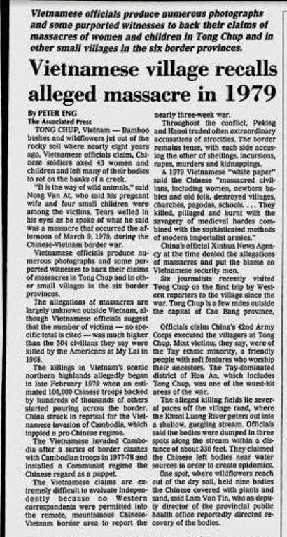 Tài Liệu 5: Bản Tin ngày 2 Tháng Một, 1987 trên tờ báo Gainesville Sun, Florida, Hoa Kỳ về vụ tàn sát thường dân Việt Nam tại Tổng Chúp, Xă Hưng Đạo, Huyện Ḥa An, Tỉnh Cao bằng bởi quân Trung Quốc trong cuộc chiến tranh biên giới năm 1979. Đă dịch toàn bản tin sang tiếng Việt kèm theo nguyên bản tiếng Anh.