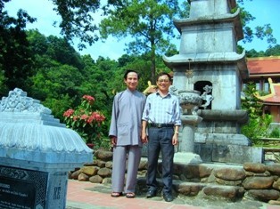 Tác giả (bên phải) và nhà nghiên cứu Phật học Lê Mạnh Thát bên tháp Chân Nguyên