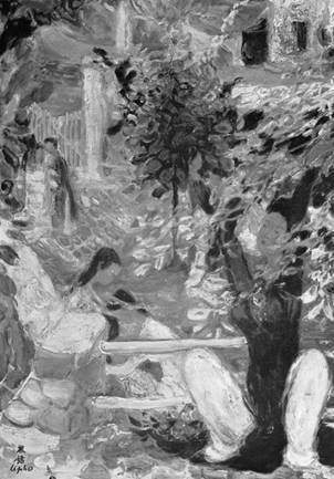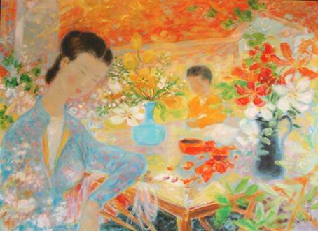 Bức tranh khổ 75x100 cm, vẽ phụ nữ và đứa con bên bàn hoa ngoài vườn. Nắng oà vỡ bao quanh thành từng đốm chao lộng, hoá thân ra màu, luân lưu qua vùng lân hư như những lằn ranh luân hồi êm ả. Giai nhân ngồi đó. Không tên. Danh xưng tan toả theo từng làn hương của trí nhớ. Toa rập với phập phồng. Môi vô ngôn và mắt khép địa đàng. Mày ngấn dấu trăng xưa trên vừng trán nhẵn luống thời gian. Mọi vật thể biến thành trăm phiến tâm lung linh. Ít ai vẽ được ngọn nắng tâm hồn nhảy bay trên mắt như thế. Chiếc độc b́nh màu huyền dạ cắm những đoá b́nh minh. Màu đen tinh anh của Đêm đầu tiên đẻ ra Ngày đầu tiên mà ta đă quên. Nay người hoạ sĩ trả lại. Như vũ trụ chi viện từ bao thiên kỷ cho mặt trời nhú mọc.