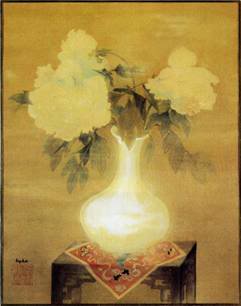 Nh́n những tác phẩm của Lê Phổ, chúng ta thấy dấu vết học hỏi, t́m ṭi này. Đầu thế kỷ XX, tranh anh vẽ không thua ǵ tranh Trung quốc. Tôi được ngắm nơi pḥng khách nhà anh bức «Hoa mẫu đơn» diệu vợi. Chiếc độc b́nh nơn nà sắc trắng trinh bạch quyến cùng hoa lá. Mẫu đơn như từ đấy mọc ra. Chút mờ ảo sương khói, chút vần vũ khói hương, chút nhớ nhung tiền kiếp. Nếu bỏ đi khuôn triện và tên Lê Phổ dưới góc tranh, ai bảo đấy là tranh đời Tống, đời Minh, tôi sẽ gật đầu khen đúng.